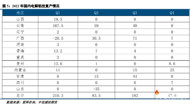 據(jù)愛(ài)擇咨詢統(tǒng)計(jì), 2022年4月份國(guó)內(nèi)原鋁產(chǎn)量為332.24萬(wàn)噸,較上月減少5.12萬(wàn)噸,同比上漲1.33%,年化產(chǎn)量4042.25萬(wàn)噸,在產(chǎn)產(chǎn)能創(chuàng)歷史新高。其中Q1復(fù)產(chǎn)產(chǎn)能在210.3萬(wàn)噸,Q2復(fù)產(chǎn)產(chǎn)能將近83.5萬(wàn)噸,上半年復(fù)產(chǎn)產(chǎn)能近300萬(wàn)噸,供應(yīng)壓力明顯。且下半年仍有229.6萬(wàn)噸產(chǎn)能計(jì)劃復(fù)產(chǎn)。