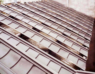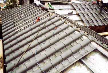 鋪屋面主瓦是指屋面鋪設(shè)要求瓦縱橫線條整齊,相互垂直,瓦片搭蓋疏密一致,屋主瓦翹起部位的底部應(yīng)用砂漿輔實. 其屋面瓦施工工藝: •基層清理 •1:2.5水泥砂漿臥底 •鋪瓦 • 細部處理 • 檢查驗收 •淋水試驗。 屋面瓦安裝順序: ①自下而上從右至左;先收口,后大面(先安裝檐口、 陰溝、泛水瓦,后安裝大面容易操作的瓦),每片主瓦的瓦爪必須緊扣掛瓦條,隔排錯縫排瓦。 ②由于本工程為高層建筑,所以所有瓦必須要用專用釘或者銅絲固 定。 ③ 斜脊部位主瓦瓦爪被截無法掛瓦時,必須固定。 ④ 瓦的橫向排列:從防水性能和施工復(fù)雜程度考慮,應(yīng)以整片對縫排列為優(yōu)先;如果設(shè)計另有要求應(yīng)按設(shè)計實行。