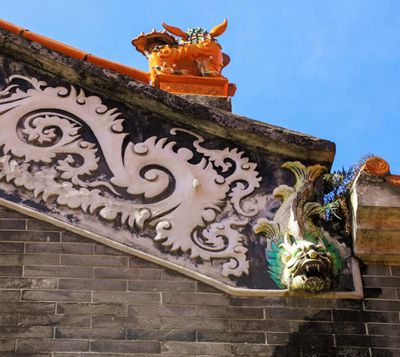不僅中國宮殿里有這種滴水神獸,越南的順化皇城也毫不例外,在兩處屋頂?shù)慕唤犹帲b飾了一個(gè)巨大的龍形滴水神獸,在滿足排水的功能外,在敬畏天地鬼神的年代,其辟邪壓勝的象征意義,還給居住者一種精神上的慰藉。