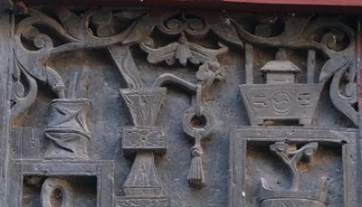 常見傳統(tǒng)磚雕戧檐圖案有,花卉、動物、植物、博古等其它類別。如,月季花、牡丹花、荷花、菊花、海棠花、蘭花、吉祥草等。又如,仙鶴、喜鵲、獅子、麒麟、松鼠、魚、羊、鹿、鴛鴦、吉祥鳥等。再如,柿子、玉蘭、竹子、松柏、靈芝、仙桃、葡萄、花籃、枝藤蔓葉等。