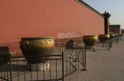 據(jù)《大清會典》記載,紫禁城內(nèi)曾有大缸308尊。由于歷史的變遷,現(xiàn)還剩200余尊。在宮殿前設(shè)置的這些大缸,稱之為“門海”,每尊可貯水3000多升,過去由幾十個太監(jiān)專門負(fù)責(zé)管理,每天派勞役從井內(nèi)吊水,一擔(dān)一擔(dān)把缸打滿。夏天要保證水質(zhì)干凈,沒有異味;冬天除在缸口加蓋之外,還在大缸外圍包上一層棉絮外套,在特別嚴(yán)寒的季節(jié)里,要把缸架在特制的石圈上,下燃炭火,晝夜不熄,以免缸水凍結(jié)。
