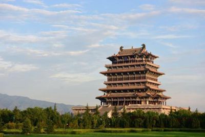 三是各種形制屋頂。屋頂造型是最富藝術(shù)魅力的部分,在宗法社會制度下,它也是衡量建筑物等級的主要標志。其等級次序由高到低依次為廡殿頂、歇山頂、懸山頂和硬山頂,攢尖頂其中重檐又高于單檐。屋頂起翹、出翹,使屋頂翼角和檐口出現(xiàn)了優(yōu)美的曲線如翚斯飛,使立柱有意稍稍向內(nèi)傾斜的“側(cè)腳”和外圍柱由中心向隅角逐漸加高的“生起”方式,從而增加建筑動感。太原晉祠圣母殿建筑手法即充分體現(xiàn)了這種特色。