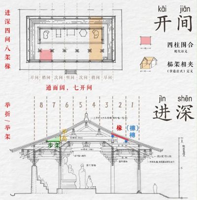 進深:主要是指橫向梁架的深度。通過柱子之間的距離以及梁架椽子的數(shù)量來確定“進深”的概念。