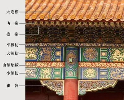 大連檐:在清式建筑大木作中是一種構(gòu)件,宋式則稱作“小連檐”。它位于屋檐檐頭,安置在飛椽之上,其上皮是瓦口木,呈三角形斷面。長度能達到仔角梁端頭,會隨著翼角翅起而緩緩上升。
