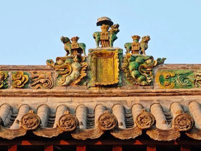 陽(yáng)城湯王廟獻(xiàn)亭上的吻獸、脊飾、溝滴、排山、懸魚(yú)、博風(fēng)板等等都用琉璃作為裝飾件。根據(jù)屋頂吻獸背部題記可以知道其為明成化十七年本縣匠人所制;此類琉璃制品以白坩土為胎,施以黃、綠、藍(lán)、白、醬五色釉面;鴟吻上附著有一條小龍,昂首望天;鴟吻尾部類似于魚(yú)尾分叉,有遼代鴟吻的神韻;屋脊側(cè)的行龍姿態(tài)各異,垂脊下端塑有一條完整的行龍作垂獸,其面目猙獰,神態(tài)威武,而在四角處有嬪伽端莊的作為脊端,姿態(tài)威嚴(yán)雄壯。