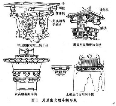 中國(guó)古建瓦筑從總體上說(shuō)是以木結(jié)構(gòu)為主,以磚,瓦,石為輔發(fā)展起來(lái)的。從建筑外觀上看,每個(gè)建筑都有上,中,下三部分組成。上為屋頂,下為基座,中間為柱子,金屬瓦門窗和墻面。在柱子之上屋檐之下還有一種由木塊縱橫穿插,層層疊疊組合成的構(gòu)件叫做斗拱。這是以中國(guó)為代表的東方建筑所特有的構(gòu)件。它既可承托屋檐和屋內(nèi)的梁與天花板,又儼然具有較強(qiáng)的裝飾效果。斗拱這個(gè)詞在談?wù)撝袊?guó)古建筑中不可不提,由于它在歷代建筑中的做法極富變化,因而成為古建筑鑒定的最主要依據(jù)。銅瓦