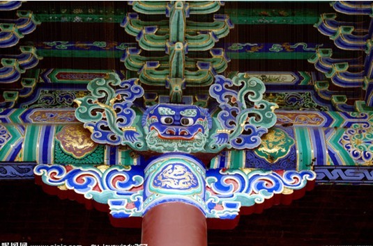所有屋頂皆具有優(yōu)美舒緩的屋面曲線琉璃瓦。無(wú)論它是源于古人對(duì)杉樹枝形還是對(duì)其他自然界物質(zhì)的模仿。這種藝術(shù)性的曲線先陡急后緩曲,形成弧面。不僅受力比直坡面均勻,而且易于屋頂合理的排送雨雪。銅瓦