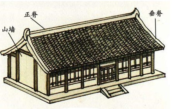 等級(jí)再次的屋頂主要有懸山頂(只有前后兩個(gè)坡面且左右兩端挑出山墻之外)仿古瓦廠。