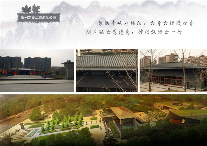 秦二世陵遺址公園位于西安曲江池遺址公園南岸,是區(qū)域景觀(guān)軸線(xiàn)(大雁塔—芙蓉園—曲江池—秦二世胡亥墓)的南端口,占地面積約70畝,其中建筑面積4714平方米。園區(qū)的主要建筑包括游客服務(wù)中心、展覽館主樓、展覽館副樓、秦二世陵墓等;功能內(nèi)容上則集遺址保護(hù)、秦文化展示、觀(guān)光游覽、公共公園、消費(fèi)休閑等多種功能于一體。園區(qū)的建筑風(fēng)格具有秦風(fēng)特色,以直線(xiàn)、幾何、陣列等簡(jiǎn)潔的手法體現(xiàn)秦文化的壯美、力量和宏大,與其他唐韻園林形成顯著差異,成為曲江獨(dú)具特色的遺址公園。